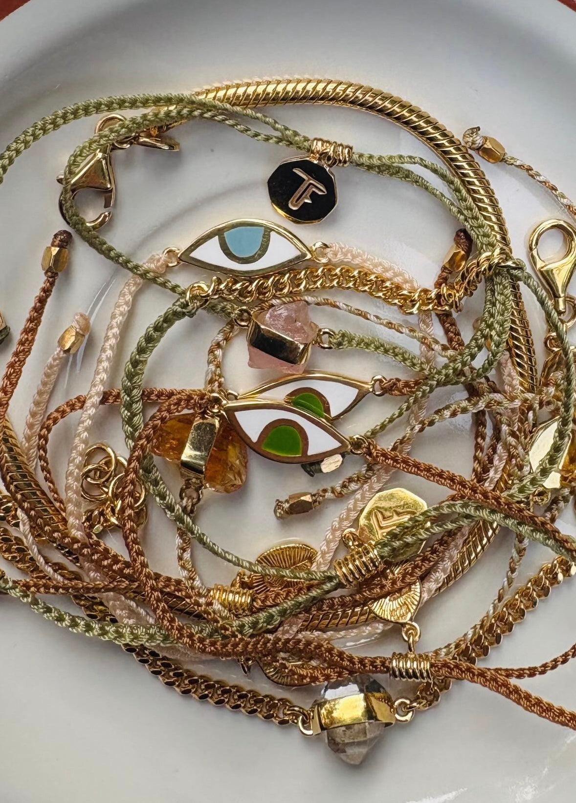 TIGER FRAME - BLESSING BRACELET - SAGE GREEN AND CREAM WITH PERIDOT CRYSTAL - GOLD